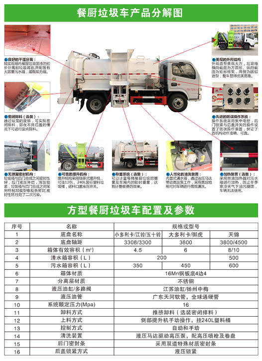 1、該車用于餐廚垃圾收集清運,主要專用裝置為垃圾桶升降裝置,封閉式垃圾罐等裝置。該車僅選用2800mm和3300mm軸距底盤,外形長度/軸距對應關(guān)系為(mm):5185/2800,5685/3300。2.側(cè)/后防護材料為Q235,側(cè)防護螺栓連接,后防護焊接,截面尺寸100×50mm,下邊緣離地高400mm。3.ABS生產(chǎn)廠家/型號:威伯科汽車控制系統(tǒng)(中國)有限公司/ABS-E 4S/4M;浙江萬安科技股份有限公司/VIE ABS-II;廣州瑞立科密汽車電子股份有限公司/CM4XL-4S/4M;蕪湖伯特利汽車安全系統(tǒng)有限公司/WBTL-ABS。隨底盤選裝駕駛室。 |