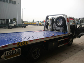 該車平板長度為5.6米,寬2.3米。平板采用模具沖壓式凸紋板分塊組合,在裝載輪胎壓滾面域,噴附防滑 顆粒狀物質(zhì),磨擦系數(shù)增大,較一般平板約增大2~3倍的磨擦附著力。平臺總成采用 新一次性壓制成型制作,加強型槽鋼橫梁固定、既減輕了整車重量,又增加了托舉和裝載能力,還增加了平臺裝載面的防滑功能,即美觀又實用。