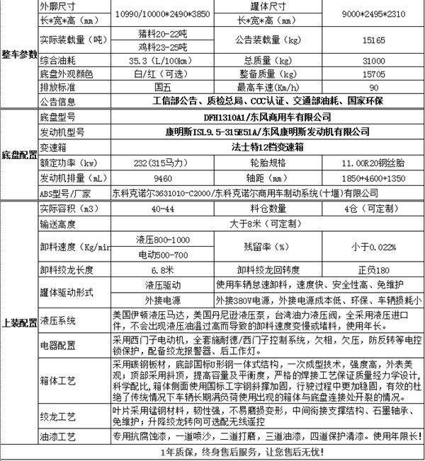 溫馨提示:生產(chǎn)周期為20個(gè)工作日 購(gòu)車服務(wù)咨詢電話:13277608333 上裝配置: 箱體容積40立方米,分四倉(cāng),可同時(shí)裝不同飼料,箱體尺寸:9000*2495*2310mm,電動(dòng)絞龍采用西門子電機(jī)、德力西電器/液壓絞龍采用美國(guó)進(jìn)口雙聯(lián)液壓泵、液壓馬達(dá)、液壓控制閥。卸料速度為電動(dòng)600kg/min/液壓1000kg/min,卸料高度≥8m(標(biāo)配8米,可定制),殘留率≤0.022%,專用抗腐蝕油漆,一道噴砂,二道打磨,三道油漆。
