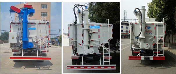 上裝配置:罐體材質(zhì)采用4mm優(yōu)質(zhì)碳鋼板,整車3條絞龍,由3個(gè)5.5KW電機(jī)帶動(dòng),頂部絞龍用液壓控制舉升,可左右旋轉(zhuǎn)180度,罐體可根據(jù)用戶要求做多個(gè)獨(dú)立分倉,可以獨(dú)立控制各分倉卸料順序和速度。